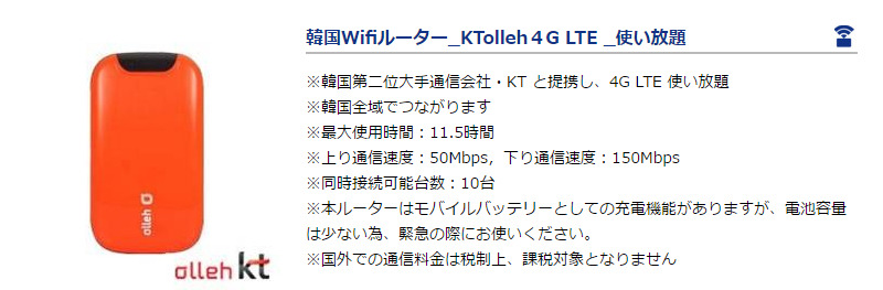 韓国Wifiルーター_KTolleh4G LTE _使い放題