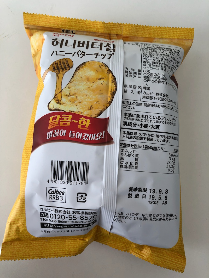 2019/06/06 / 最終更新日時 : 2019/06/06 blooming 韓国おやつ ハニーバターチップ、日本上陸! 昨日、近所の西友に行ったら、 懐かしいおやつ発見 カタカナも書いてある、ハニーバターチップ 早速食べてみましたが、味は、以前食べたことがあるハニーバターチップ でも・・・これ、カルビーのポテトチップス ハニーバター味、かな。 だいぶ前に食べたきりなので食べ比べが出来てないけれど、 ポテトの食感がちょっと違ったような気がする。 (気のせいか、カルビーのほうが薄い気がする・・・) 韓国では一時のブームが去ったのか、普通に売ってるかんじですが、 日本では期間限定だそうなので、探してみてください Follow me! FacebooktwitterHatenaPocketCopy